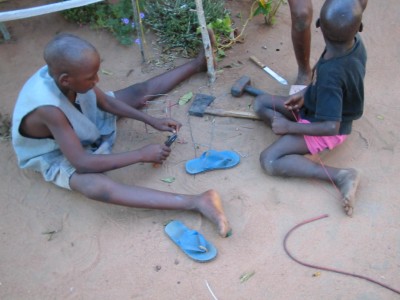 This boy is making a toy pickup truck out of some wire and strips of rubber. Kevin bought it from him to put on his display table during summer 2004 mission presentations. |