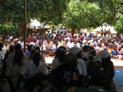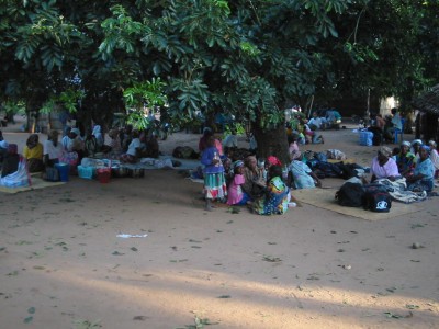 A visit from a missionary brings people in from all over the area. Here, women and children from different places gather under the trees on Saturday evening to rest from a long day of travel. (The men were similarly congregating elsewhere.) |