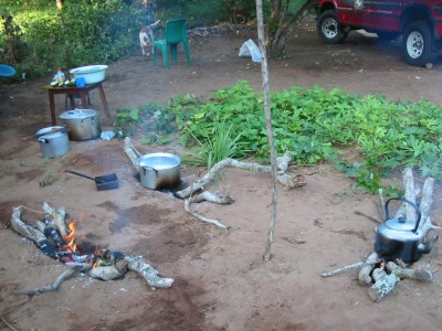 Here's a typical makeshift kitchen for such an event. Dig a hole, build a fire in the hole, rest the large pot above the fire. |