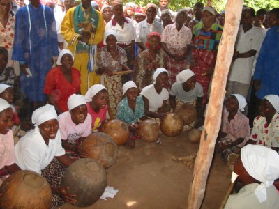 Those aren't pumpkins, they're a kind of drum, and this is a percussion choir of some renown in the area. By slapping the drums and hitting them against the ground, deep echoing sounds are produced to accompany their singing. It was an unbelievably rich sound. |