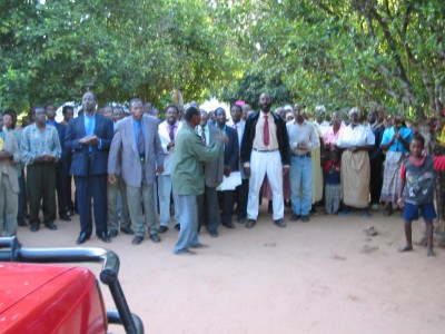 This is the typical view from the perspective of a missionary upon arriving somewhere for a visit. As the vehicle comes to a stop, the people stand and gather to sing songs of greeting, welcome, and thanks to God for sending someone to share His word with them. Most of the well-dressed men in front are preachers from the area. |